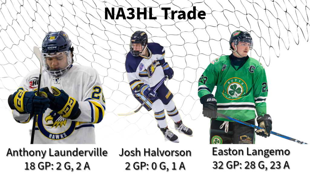With the NA3HL trade deadline approaching the Butte Irish today dealt their leading scorer and Captain Easton Langemo to the Sheridan Hawks. In exchange, the Hawks have sent a pair of forwards in Anthony Launderville and Josh Halvorson.